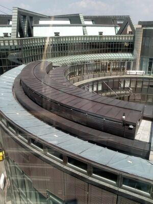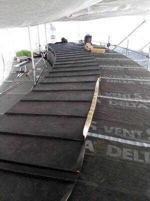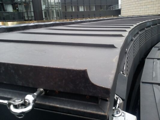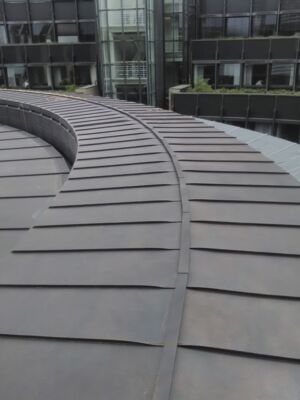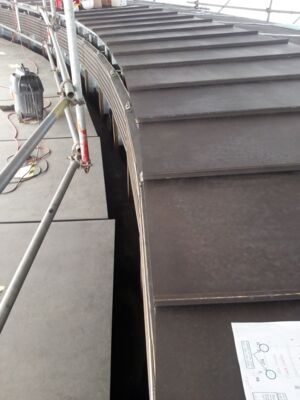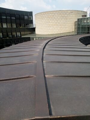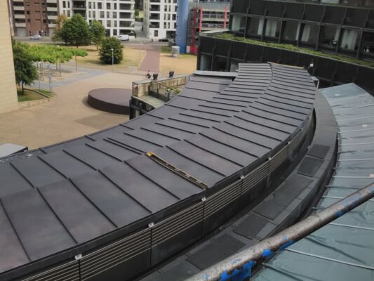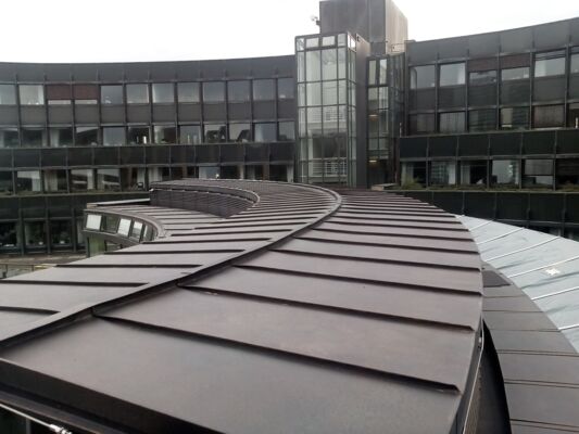 Es folgten der Aufbau der Stahlbau-Konstruktionen und das Anbringen von Fassadenbekleidungen durch Drittgewerke. Anschließend haben wir die Stehfalzscharen aus Sonderlegierung verlegt. Alle Scharen waren auf Grund der gerundeten Grundrissform der Dachfläche einzigartig. Es gab kaum gleiche Scharen.