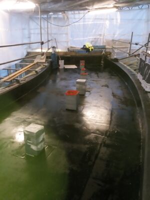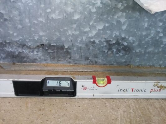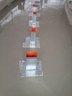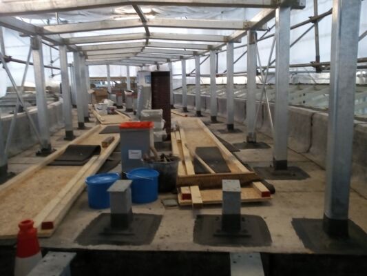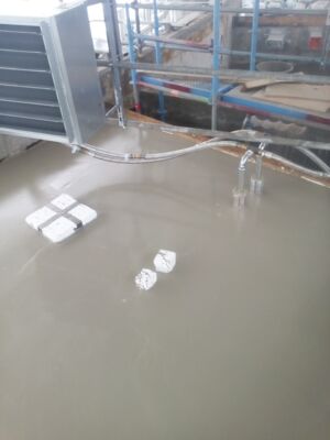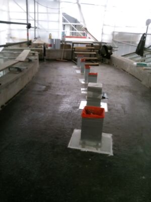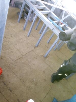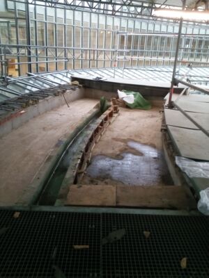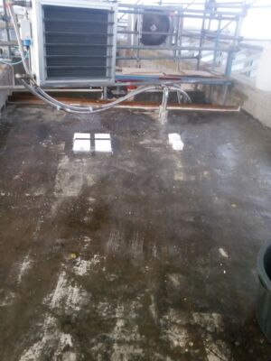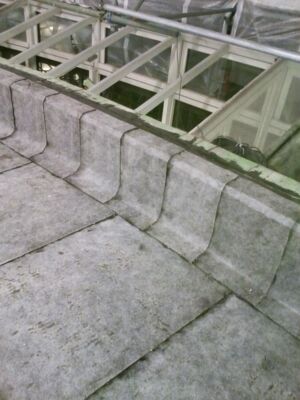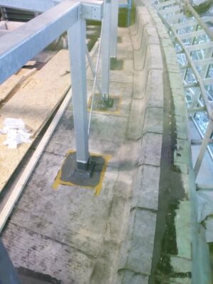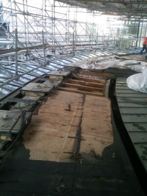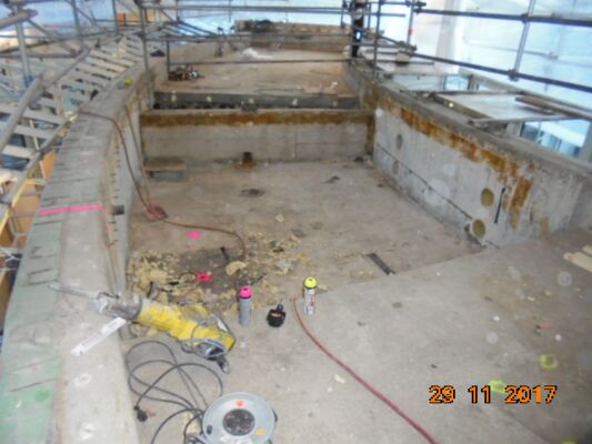 Den überwiegenden Teil der Leistungen haben wir unter einem Schutzdach ausführen können. Nach dem Abbruch der Metalleindeckungen und Holzkonstruktionen wurde der Zustand der Rohbauoberflächen vermessen und für das Aufbringen von Dampfsperre aus Bitumenbahnen begutachtet. Dabei stellten sich erhebliche Unebenheiten und ungünstige Gefälle im Rohbau heraus. Die Betonoberflächen wurden mit Voranstrich bzw. Grundierung behandelt und mit selbstnivelierenden Massen für weitere Dacharbeiten vorbereitet. Erst anschließend war es möglich, die Dampfsperre fachgerecht aufzubringen.