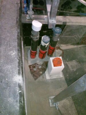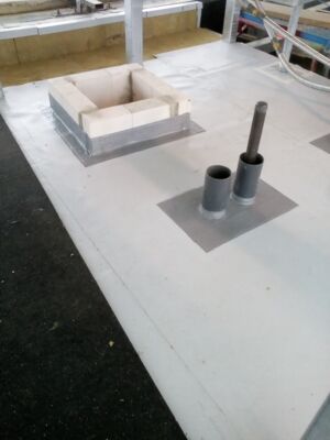 Nach der Verlegung der Dampfsperre wurden alle Durchdringungen mit Flüssigkunststoff-Abdichtungen eingefasst. Die sehr hohe Anzahl der Durchdringungen verlangte von den Handwerkern bei der Verlegung der Gefälledämmung aus Steinwolle eine Menge Geduld und Sorgfalt ab. Nach der Verlegung der Folienbahnen wurden alle Durchdringungen ebenfalls mit Flüssigkunststoffen eingedichtet.