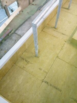 Ein paar Zahlen: Dampfsperre ca. 160 m², Gefälledämmung aus Steinwolle ca. 93 m², Folienabdichtungen ca. 130 m², Anzahl der abzudichtenden Durchdringungen ca. 142 Stück, Umfang der Metalldachfläche ca. 76 m².