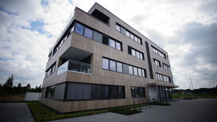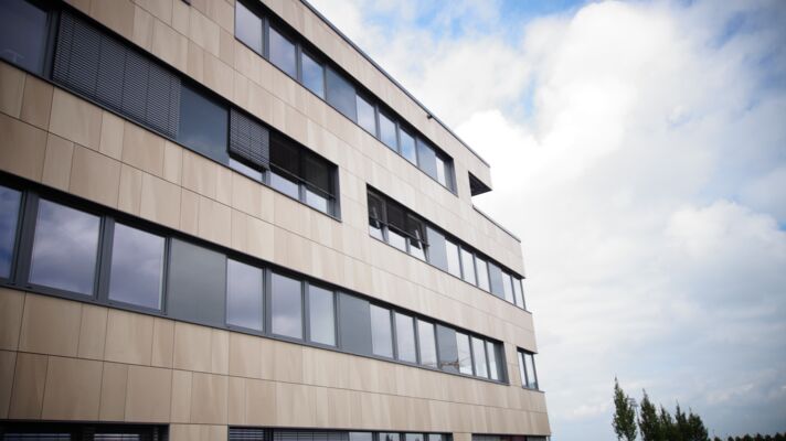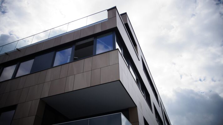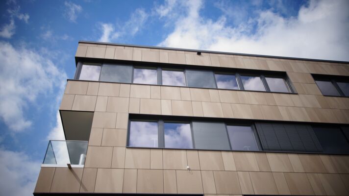 Auf rund 700 m² umhüllt eine vorgehängte hinterlüftete Fassade mit hochwertigen MOSA-Keramikfliesen dieses Gebäude. Die Fliesen sind auf einer mehrteiligen, justierbaren Aluminium-Unterkonstruktion montiert – mit einer Befestigung, die fast unsichtbar bleibt.