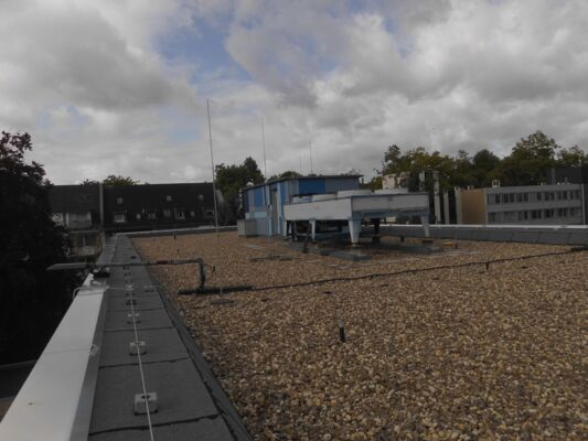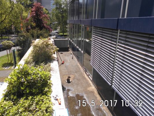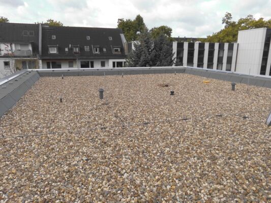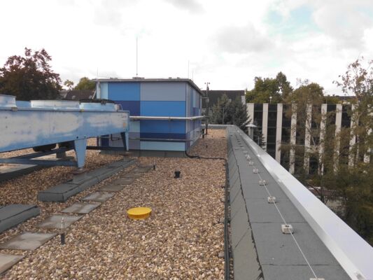 Unser Auftrag aus dem Jahr 2017 umfasste eine Komplettsanierung mehrerer Dachflächen und eine Erneuerung von Fassadenbekleidungen an dem Aufzugshaus. Insgesamt haben wir ca. 1.300 m² an Dachflächen saniert, ca. 266 lfdm an Dachrandprofilen verbaut, ca. 55 m² an neuen Fassadenbekleidungen aus HPL angebracht.