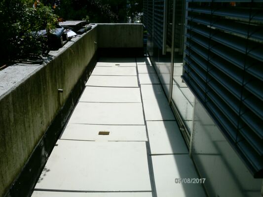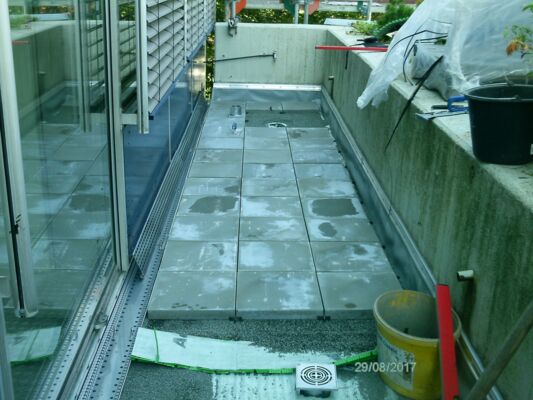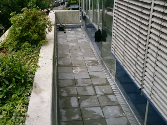 Auf der schmalen Terrasse wurde Vakuumdämmung verbaut, damit man die aufgehenden Wandanschlüsse zum Gebäude hin fachgerecht herstellen konnte. Besondere Herausforderungen bestanden in engen Platzverhältnissen auf dem Gelände für die Logistik von Abbruchmaterialien und Antransport neuer Baustoffe.